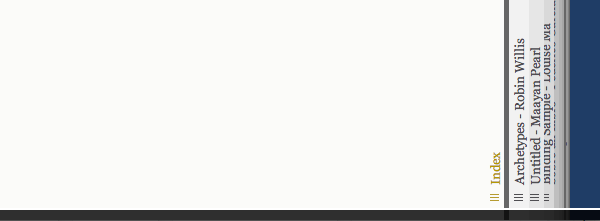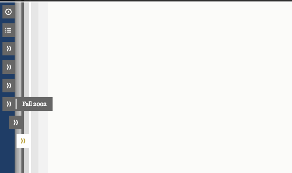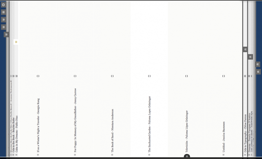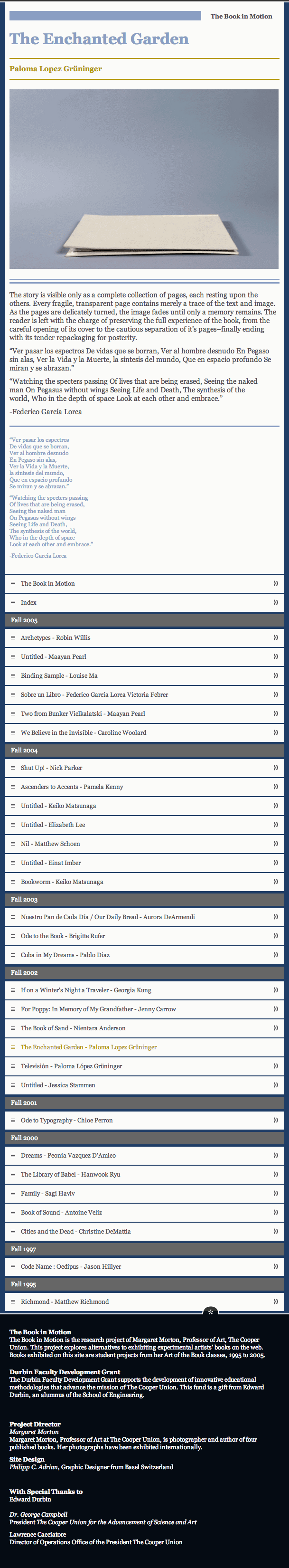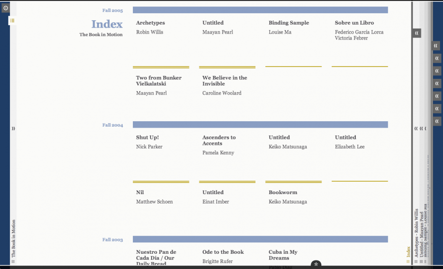 There is no conventional main navigation. Inspired by the physical book the next and previous pages can be access on the left and right hand side of the screen. To still be able to find a certain project quickly, the projects are categorized by chapters. Each chapter is represented by a divider between the pages. When clicking on one of these dividers one gets an overview of all projects within this chapter.