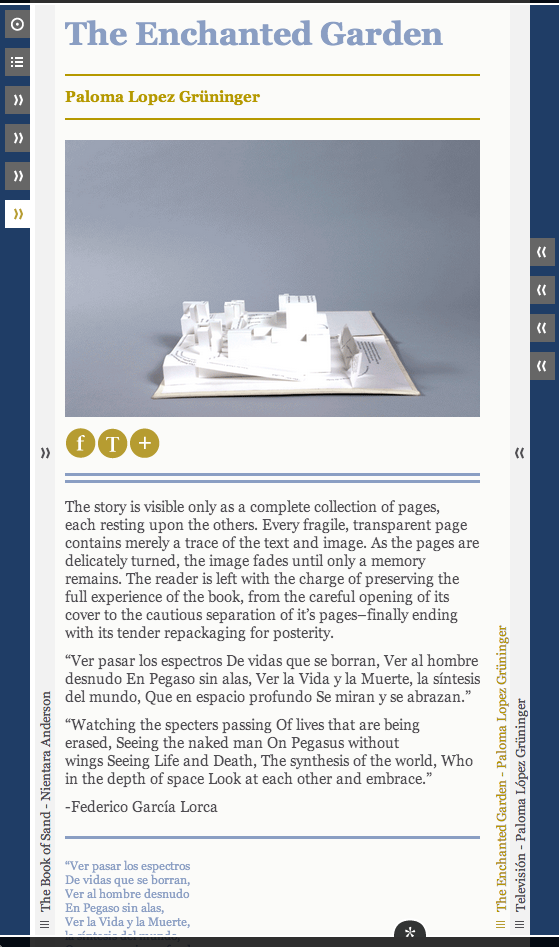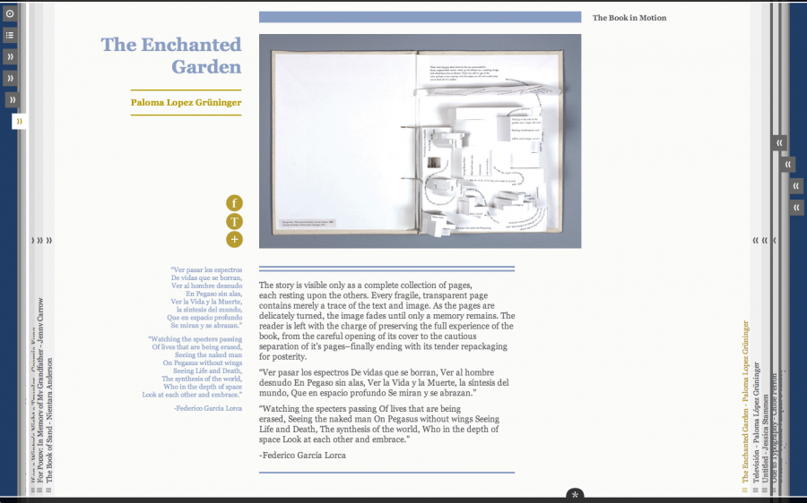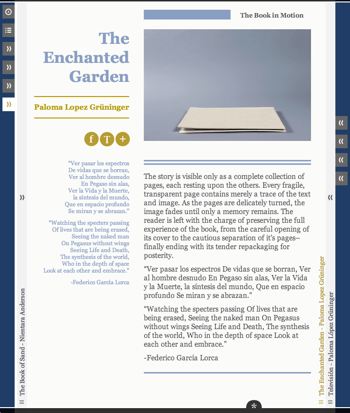 As the name tells, the book in motion is not only displaying all kinds of different book projects, but should also be a book itself. The design takes the name quite literally and aims to let the user feel as if fliping the pages of a book. But while resembling a book, it still takes full advantage of its non-pysical existence and modern web technologies. This allows the pages to spread out evenly to allow an easy overview over chapters and also transfroms the book in motion from a foliant on the desktop to a pocket book on the smart phone.